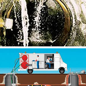 When a leak is located by the television camera, our technician stationed in a mobile laboratory at the job site can isolate and seal the leak, usually in less than a minute. Pipe condition, type of leak, type of soil, chemicals present in the sewage and groundwater pressure are all factors that are considered before selecting a chemical/catalyst combination that is most suitable for each individual job.